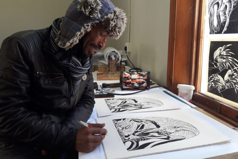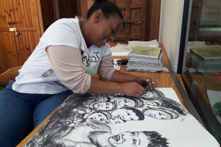 The artists at the Centre were the first in the village to be re-connected to their ancestral identity. They grew up in the township or on farms with the name “Bushman” as a pejorative term, and accepted their apartheid designation as “coloured”. Afrikaans, the language of the invaders, was the only language they knew. But through the museum, the wider community are finding and proudly identifying with their origins as Bushmen.