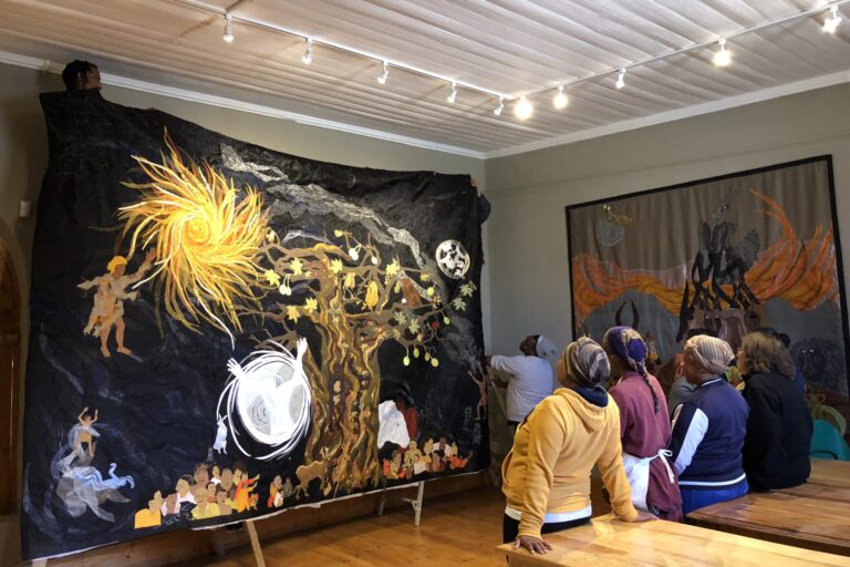 We are a group of artists of /Xam descent in the village of Nieu Bethesda. We invite visitors to our Centre to experience our friendly hospitality in welcoming accommodation and to explore our tapestries of Bushman mythology. Chat to us in the studios where we work and buy our stunning artwork and craft at very reasonable prices.